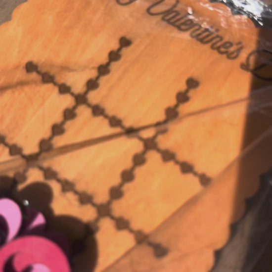 This wooden tic tac toe set features a Valentine-themed design and includes heart game pieces, making it perfect for school Valentines, classroom exchanges, Valentine baskets, or a sweet surprise for little ones.